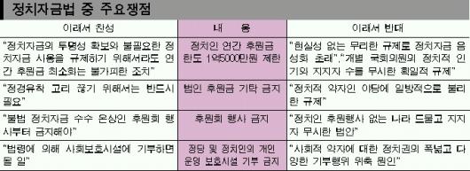 반면 정치자금법 개정에 반대하는 목소리도 만만찮다. 법 개정을 주도했던 한나라당의 오세훈 전 의원은 “의원들이 다소 불편하고 가난하더라도 국민의 큰 환영을 받았던 법을 제대로 정착시키지 않고 다시 개정하는 것은 잘못”이라고 비판했다.