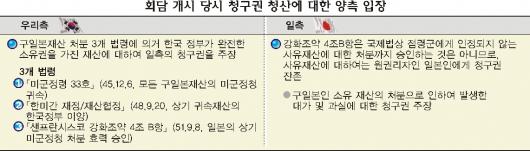 물론 현재로선 이런 요구들이 액면 그대로 받아들여지기는 쉽지 않을 전망이다. 일본은 말할 것도 없고 여태까지 우리 정부의 공식 입장도 사실상 개인 청구권은 모두 소멸됐으며 재협상도 불가능하다는 것이기 때문이다.