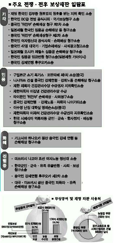 한일협정을 통해 일본 정부로부터 받은 무상 3억달러(당시 원화 948억여원) 중 우리 정부가 실제 개인보상에 사용한 금액은 불과 91억 8769만원(9.7%)에 불과했다.