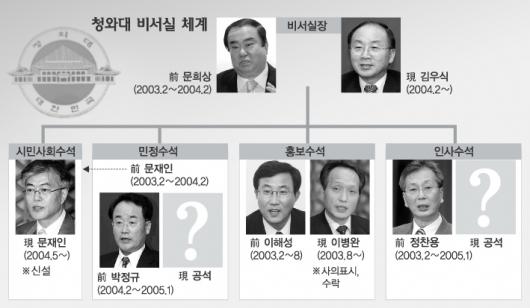 노무현 대통령이 청와대 비서실 ‘새판짜기’에 나섰다. 민정·인사수석에 이어 홍보수석을 교체하기로 함에 따라 비서실내 네 명의 수석 가운데 세 명을 바꾸게 된다.