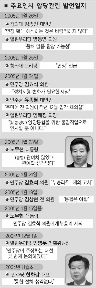 노무현 대통령은 26일 임채정 의장 등 열린우리당 새 지도부를 청와대로 초청해 만찬을 베푼 자리에서 느닷없이 “일희일비하지 말자.”면서 인연을 강조했다. 노 대통령의 이같은 언급은 민주당 한화갑 대표가 열린우리당과 민주당간의 연정론에 대해 ‘선(先) 대통령 탈당’을 제기하며 반발하는 가운데 나온 것이어서 주목된다.
