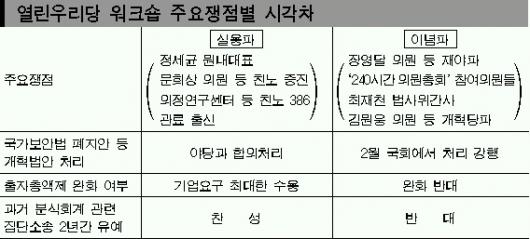 2월 1일 임시국회를 앞두고 열린우리당은 다음달 4·5일 서울 서초동 교육문화회관에서 소속 의원 전원이 참석하는 워크숍을 갖고 핵심 쟁점 사안들에 대한 이견을 조정할 예정이다. 신임 지도부는 경제를 중심에 둔 ‘실용노선 전환’을, 강경 소장파 의원들은 국가보안법 폐지안 등 개협법안 처리에서 ‘개혁당론 유지’를 고수하고 있어 갈등이 불가피할 전망이다.