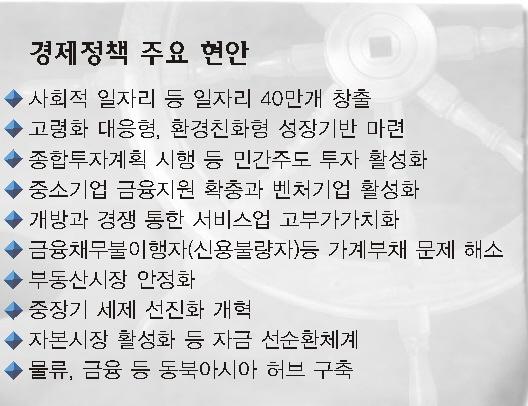 ‘이헌재 경제팀’이 올해 설정한 지상과제는 ‘40만개 일자리 창출을 위한 5% 경제성장’이었다. 이를 위해 상반기에는 재정을 조기집행해 가계소비와 기업투자 부진을 벌충하고 하반기에는 종합투자계획을 실행해 민간자본을 대형 국책사업에 끌어들이겠다는 구상을 갖고 있었다. 이런 정부의 계획은 대부분 그대로 추진될 것으로 보인다. 또 생계형 금융채무불이행자(신용불량자) 등 가계부채 문제 해소, 부동산시장 안정, 중소·벤처기업 활성화, 서비스업 선진화, 세제 선진화 등 작업도 대체로 큰 틀을 유지할 것으로 예상된다.