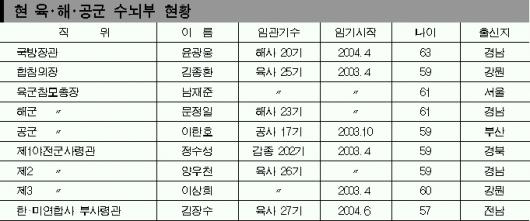 현재의 군 수뇌부는 지역별로 영남 4명, 강원 2명, 서울 1명, 호남 1명이다. 영남이 좀 많은 편이다. 또 임관 구분별로는 과거처럼 한 명의 비(非)육사 출신이 포함돼 있다.