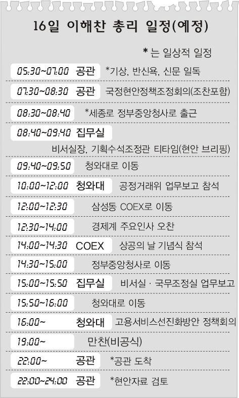 이 총리의 역할도 과거 ‘의전총리’와는 비교할 수 없을 정도로 늘어났다. 취임 이후 지금까지 공식적으로 이 총리가 주재한 회의만 800여차례에 이른다. 국무조정실이 자체 집계한 수치다. 한달 평균 100회, 하루에만 5회꼴이다. 당장 16일에만 해도 국정현안정책조정회의 등 4개의 공식일정과 3개의 비공식 일정이 놓여 있다. 짬짬이 총리실 내부 현안까지 챙기면 아침 8시40분부터 밤 10시까지 이어지는 하루 일정이 모자랄 정도다.