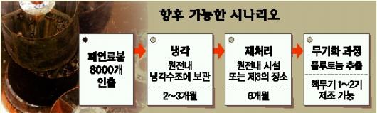 꺼낸 폐연료봉을 3개월 정도 냉각시킨 뒤 6개월가량 재처리하면 핵 무기 원료인 플루토늄을 12∼14㎏가량 얻을 수 있으며, 이 플루토늄으로 핵무기 1개 내지 2개를 만들 수 있는 것으로 알려져 있다.