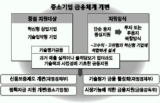 또 혁신형 기업에 대한 기술신용보증기금의 보증수수료도 0.3%포인트 인하하고 신용보증기금의 혁신형 기업에 대한 창업보증 비율은 현재 0.1%에서 2009년까지 10%로 높이기로 했다. 부채비율이 업종 평균의 2배 이하, 코스닥의 경우 1.5배 이하로 된 중소기업의 거래소 상장기준도 완화, 부채비율이 충족되지 않더라도 현금흐름이 좋으면 중소기업의 상장을 허용키로 했다.
