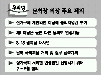 문 의장의 회견 내용은 향후 정치일정이나 파급력으로 볼 때 여권내 조율을 거친 결과물이라는 시각이 지배적이다. 하지만 야당이 일제히 반발한 데서 보듯 ‘게임의 룰’을 정하는 일이 카운터파트의 불참으로 현실화되기는 어려운 상황이다.