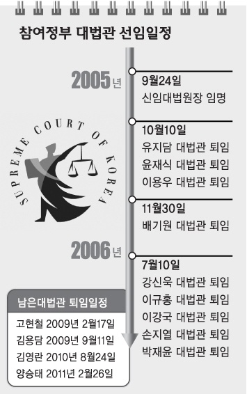 18일 선정된 이용훈 신임대법원장 지명자가 국회 동의를 거쳐 차기 대법원장에 정식 취임하면 대법원 구성에 인적쇄신의 태풍이 불 것으로 보인다. 대법원장을 제외한 13명의 대법관 중 오는 10월에 3명,11월에 한 명이 교체되며 노무현 대통령 임기내에 추가로 대법관 5명이 교체될 예정이다.11월까지 후임 대법관 4명의 제청은 대법원의 진로를 가늠해볼 수 있는 시험대가 될 전망이다. 신임 대법원장은 취임 직후 당장 10월에 퇴임하는 대법관 3명의 후임 인선작업에 착수할 것으로 보인다. 그동안 대법원은 시대에 뒤처지고 소수자를 대변하지 못한다는 따가운 소리를 들어왔기 때문에 관행에서 벗어난 변화가 예상된다. 하지만 혼란을 줄이기 위해 기수·서열파괴는 크게 없을 것이라는 관측도 있다. 김영란 대법관 이후 ‘제2의 여성 대법관’ 탄생도 기대된다. 박시환(52)·강금실(48) 등 소장 변호사들에서부터 김종대(57) 부산고법부장판사, 김황식(57) 법원행정처 차장, 이흥복(59) 부산고법원장등 법원 내부인사들까지 후보로 거론되고 있다.