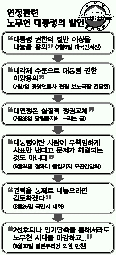 대통령 권력의 절반을 내놓겠다면서 ‘연정 카드’를 꺼낸 노무현 대통령의 언급이 갈수록 증폭되면서 ‘2선후퇴’와 ‘임기단축’ 발언까지 나왔다. 임기단축이란 사실상 하야를 의미하는 것이고, 이는 조기 대선과 정치권의 메가톤급 지각변동을 예고하기 때문에 정치권의 촉각을 곤두세우게 한다.