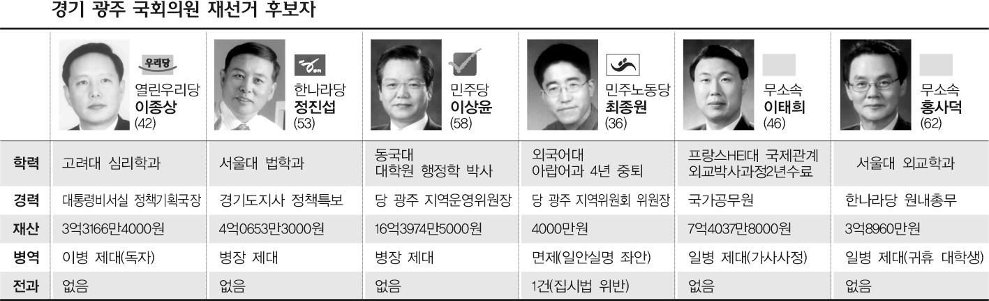 20일 경기도 광주에서는 ‘과열’이라는 말이 나오기 시작했다. 아닌 게 아니라 벌써부터 이런저런 풍문이 떠돌기 시작했다.“홍사덕 후보가 사퇴한다더라.”“정진섭 후보는 당선돼도 출생지 허위 기재로 또 재선거를 치러야 한다더라.”는 얘기들이 나돈다. 투표율도 선거 캠프마다 40%에 육박할 것으로 예상하고 있다. 시장통 상인들도 제법 후보들의 이름을 알고 있다. 후보 이름도 알려지지 않아 투표율이 30%를 밑돌 것으로 예상되는 다른 선거구와는 확실히 다른 양상이다. 하긴 한나라당 예비후보만 14명이 경쟁적으로 사무실을 내고 선거운동을 했던 곳이다.
