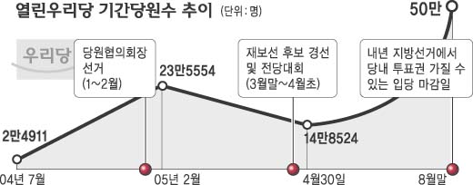 실제 지난해 7월 2만 5000여명에 불과했던 우리당 당원 규모는 지난 2월 당원협의회장 선거를 전후 23만 5000여명으로 늘었다. 이어 3∼4월 재·보선 후보 경선과 전대를 마친 뒤 14만 8000명 수준으로 빠졌다가 내년 지방선거 공직 후보자 당내 경선시 투표권을 행사할 수 있는 입당 마감일인 8월 말 50만여명으로 급증했다.