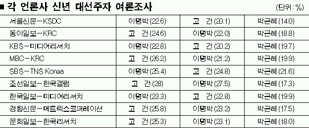 새해를 맞아 각 언론사가 여론조사를 통해 밝힌 대선 주자들의 성적표다. 이명박 서울시장의 상승세가 눈에 띈다. 이 시장은 ‘청계천 특수’를 거머쥔 탓에 지난해 상반기에 비해 ‘고른’ 지지율 반등을 보였다. 반면 안정적인 이미지로 ‘부동의 1위’를 고수해 온 고건 전 총리의 지지율은 지속적으로 떨어지는 추세다. 현역 정치인이 아니라는 점이 불리하게 작용하는 듯하다.