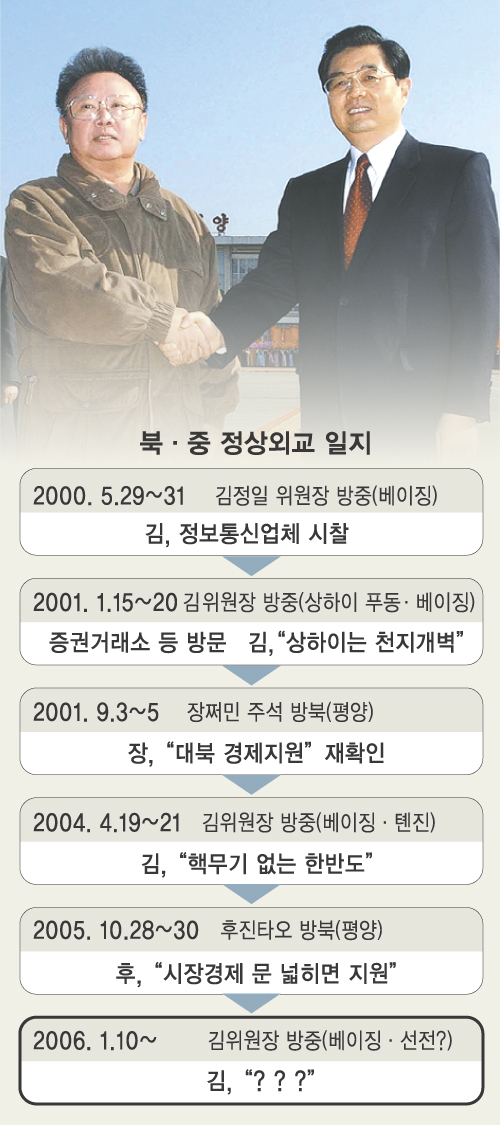 북핵문제와 북·중관계 전문가들은 2000년 이후 3차례 중국 방문을 통해 협의해온 경제원조 등의 문제는 부차적인 현안일 것이라고 입을 모은다. 지난해 10월 후진타오 주석의 방북시 서방의 구호단체 철수와 이에 따른 북한 경제 살리기에 대한 협의는 이미 끝났다는 것이다.