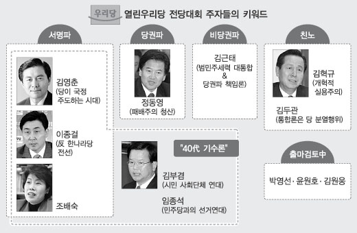 열린우리당 2·18 전당대회가 ‘혈투’를 예고하고 있다. 김근태(GT)·정동영(DY) 두 라이벌의 접전을 기본 축으로, 초·재선 서명파와 40대 재선은 물론,‘친노’의 지원사격을 받은 영남권 인사들도 채비를 마쳤다. 전장(戰場)에 뛰어들 후보는 10명 안팎으로,15일까지 5명이 공식 출사표를 냈다. 민주당과의 통합론,DY-GT의 당권파 책임론, 친노·서명파 대립 등 3대 관전포인트를 둘러싼 주자들의 키워드를 살펴보면 합종연횡 구도는 더욱 복잡하게 그려질 것 같다.