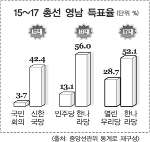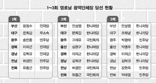 1995년 시작돼 2002년 3회째 치러진 지방선거에서 광역단체장 당선 현황을 보면 보다 명확해진다. 한나라당과 그 전신인 민자당은 호남에서 단 한 명의 광역단체장도 배출하지 못했다. 영남에서도 초대 지방선거에서 무소속 출마한 문희갑 후보가 대구시장에 당선된 것을 빼면 한나라당과 민자당 후보가 휩쓸었다.