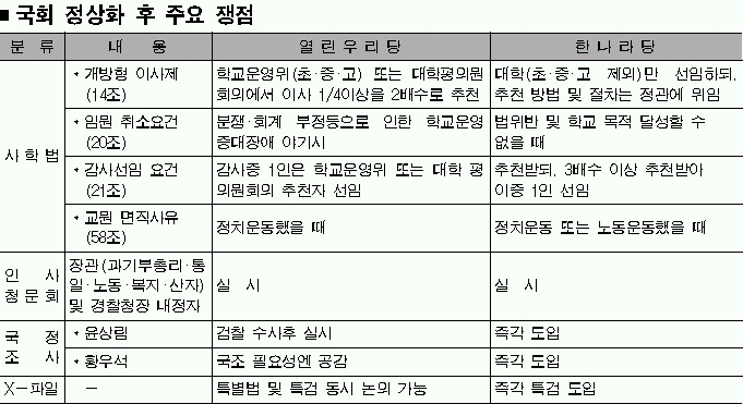 최대 쟁점인 사학법 논란은 여전히 국회 파행의 불씨로 남아 있다. 한나라당이 등원하는 전제 조건으로 재개정을 거론한 것이 아니기 때문이다. 한나라당이 이미 재개정안 초안을 마련해 국회 제출을 앞두고 있는 상태다.