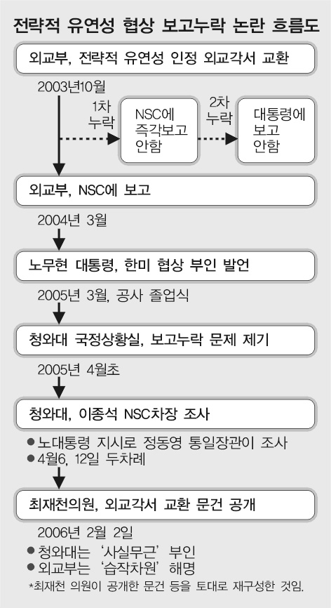최 의원이 2일 공개한 ‘국정상황실문제기에 대한 NSC입장’이란 문건은 외교부가 2003년 10월과 2004년 1월 미측과 전략적 유연성에 대한 각서를 교환했으나,2004년 3월 상부에 ‘늑장’ 보고했다고 돼 있다. 최 의원의 주장대로 외교부가 전략적 유연성을 인정해 주기로 합의해놓고 5개월 뒤에 청와대에 보고했다면 심각한 문제가 아닐 수 없다.
