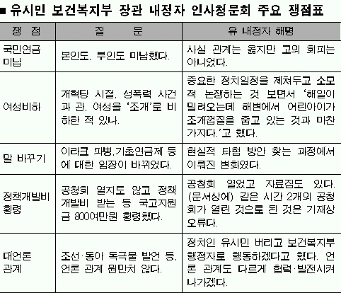 한나라당 전재희·박재완·고경화·정화원 의원 등은 유 내정자의 국민연금 미납·정책연구비 유용 의혹 등을 제기하며 도덕성을 문제삼았다. 특히 전 의원은 열린우리당 강기정 의원이 “국회의원으로서 무책임할 수 있다.”는 말에 “이유도 없이 무책임하게 말한 데 대해 위원장이 시정해달라.”며 발끈하면서 한때 험한 분위기도 연출됐다.
