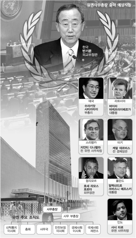 아세안(동남아국가연합)의 공동후보로 나온 태국의 수라끼앗 부총리와 유엔 군축담당 사무차장을 지낸 스리랑카의 자얀티 다나팔라 전 대통령 보좌관. 수라키앗 부총리는 “미국이 승인했다.”“110개국 지지를 얻었다.”고 지난해 초부터 떠들었고 이것이 오히려 역효과를 내고 있다는 분석이다. 태국이 남부 지역 이슬람 세력을 탄압, 말레이시아와 외교적 마찰을 일으키고 있어 이슬람권내 부정적 기류가 형성될 가능성도 배제하지 못한다. 다나팔라 전 사무차장은 유엔개혁의 적임자임을 강조하고 있다. 하지만 일각에선 유엔관료 출신인 코피 아난 사무총장이 부패 스캔들에 휘말렸다는 점에서 역풍 움직임도 엿보인다. 태국에선 수라끼앗 후보에 대해 ‘후보 철회’ 여론도 일고 있어 고촉통 전 싱가포르 총리가 대타로 나설 가능성이 있다. 라트비아의 바이라 비케프라이베르가 대통령의 경우 미국이 선호한다는 보도도 있었다. 노벨 평화상 수상자인 동티모르의 호세 라모스 호르타 외교장관, 유엔개발계획(UNDP) 사무총장인 터키의 케말 데르비스, 폴란드의 알렉산드르 크바시니에프스키 대통령 등도 잠재적 후보로 분류되고 있다.