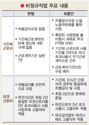 법안은 처벌 규정도 강화했다. 사업주가 차별시정 명령을 이행하지 않으면 1억원 이하의 과태료를 부과한다. 불법 파견시 사업주에 대한 형량은 1년 이하 징역 또는 1000만원 이하 벌금형에서 3년 이하 징역 또는 2000만원 이상 벌금형으로 강화했다.