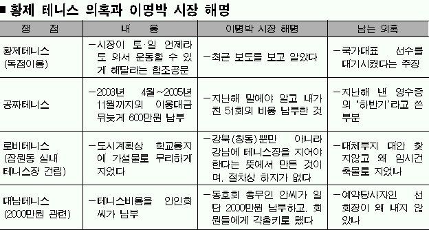 이명박 서울시장이 20일 기자회견을 통해 ‘황제 테니스’ 논란 등에 대해 직접 해명했다. 이 시장은 “시민 여러분께 깊은 사과를 드린다.”고 밝혔으나 의혹에 대해서는 “사실과 다르다.”며 전면 부인했다. 그동안 제기됐던 주요 쟁점에 대한 이 시장 의혹의 해명과 남은 의혹들을 짚어 본다.