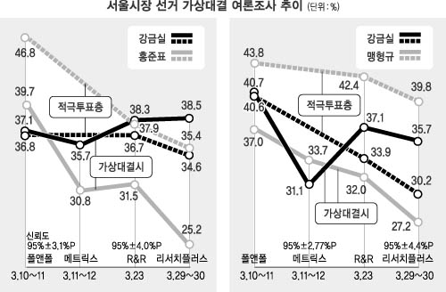 정치권에서는 20∼30대의 저조한 투표 참여율과 지방선거 자체의 낮은 투표율을 감안하면 현재의 가상대결 결과와 달리,‘박빙의 승부’가 될 것으로 관측한다. 실제로 이번 여론조사에서도 강 전 장관이 20∼30대 유권자들의 지지를 많이 받았고 50대 이상에서는 한나라당 후보를 선호했다. 최근 서울시장 출마를 선언한 민주당 박주선 전 의원도 민주당의 호남표 결집과 관련해 주요 변수가 됐다.