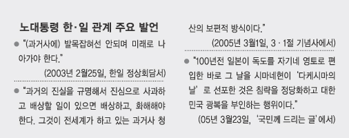 나아가 노 대통령은 국제 여론의 활용안도 내놓았다. 일본측의 잘못을 바로잡기 위해 국가적 역량과 외교적 자원을 총동원, 국제 여론에 고발하기 위함이다. 역사적·도덕적 우위를 국제사회에 홍보, 확실하게 우리 쪽으로 끌어들이겠다는 판단인 듯싶다.