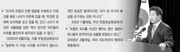 노 대통령은 독도 영유권은 어떤 비용과 희생이 따르더라도 결코 포기하거나 타협할 수 없는 문제로 인식하기도 했다. 러·일전쟁 과정에서 나타난 일본의 ‘독도 침탈 과정’을 낱낱이 적시한 것도 그런 맥락이다.‘독도의 역사성’을 통해 우리 입장의 정당성을 직접 확인시켰다. 특히 노 대통령은 일본의 독도에 대한 권리 주장에 “한국의 완전한 해방과 독립을 부정하는 행위”라고 강하게 비판했다. 그러면서 “결코 용납할 수 없다.”고 밝혔다. 일본측의 교묘한 갖가지 도발 즉, 교과서 왜곡, 야스쿠니 신사참배 등에 대해 ‘정공법’을 선택하겠다고도 했다. 주권수호 차원에서 정면으로 다뤄 나가겠다는 취지이다.
