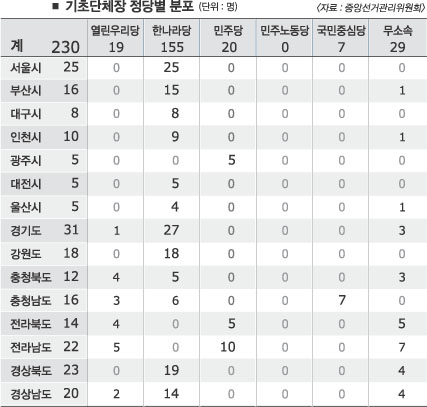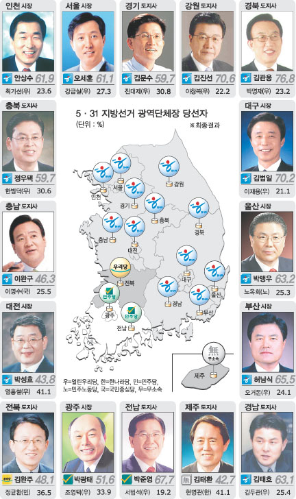 지방선거 최종 개표결과 한나라당은 서울시장은 물론이고 25개 구청장까지 100% ‘싹쓸이’하는 진기록을 세웠다. 지역구 서울시의원 96명도 완전 독식했고, 비례대표까지 포함하면 서울시의회 106석 가운데 102석이 한나라당 소속이다.96%의 기록적인 점유율인 셈이다. 반면 열린우리당은 서울시장·구청장·지역구 시의회의원 선거에서 전패했다. 전국 기초단체장 230명 가운데 열린우리당 소속은 19명으로, 민주당의 20명보다 더 뒤처졌다. 한나라당의 155명과 비교하면 8분의1 수준이다.●연패행진 열린우리당