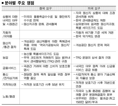 미국은 배기량에 따라 부과하고 있는 우리나라 자동차 세제의 개편을 요구하고, 농업과 섬유분야는 상품무역분야에서 떼내 별도의 협상 목록에 포함시켰다. 우리측이 주요 이슈로 제기한 개성공단 원산지 문제와 반덤핑 제도 남용 방지 등은 아예 협정문 초안에 포함시키지 않았다.