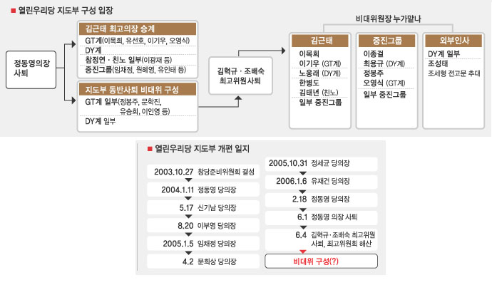 정동영(DY) 당의장 사퇴 이후 당내에서는 전당대회 차점자인 김근태(GT) 최고위원의 ‘의장직 승계’가 사태 수습을 위한 최소한의 대안으로 떠올랐다. 비대위 체제에서는 계파간 분열과 갈등으로 치달을 수 밖에 없다는 시각도 깔려 있었다. 지난 3일 당내 원로그룹 12명이 회동,“어려운 때일수록 원칙을 지켜야 한다.”며 김근태 최고위원의 의장직 승계에 힘을 보탠 것도 이같은 인식에 따른 것이다. 하지만 ‘의장직 승계’는 정동영계인 김혁규·조배숙 최고위원의 제동으로 계파간 불신의 벽을 넘지 못한 채 물거품이 됐다. 주말 반전 끝에 비대위 구성쪽으로 상황이 기울자, 선거참패의 충격에서 허우적거리던 소속 의원들은 극도의 불만과 우려를 나타냈다.