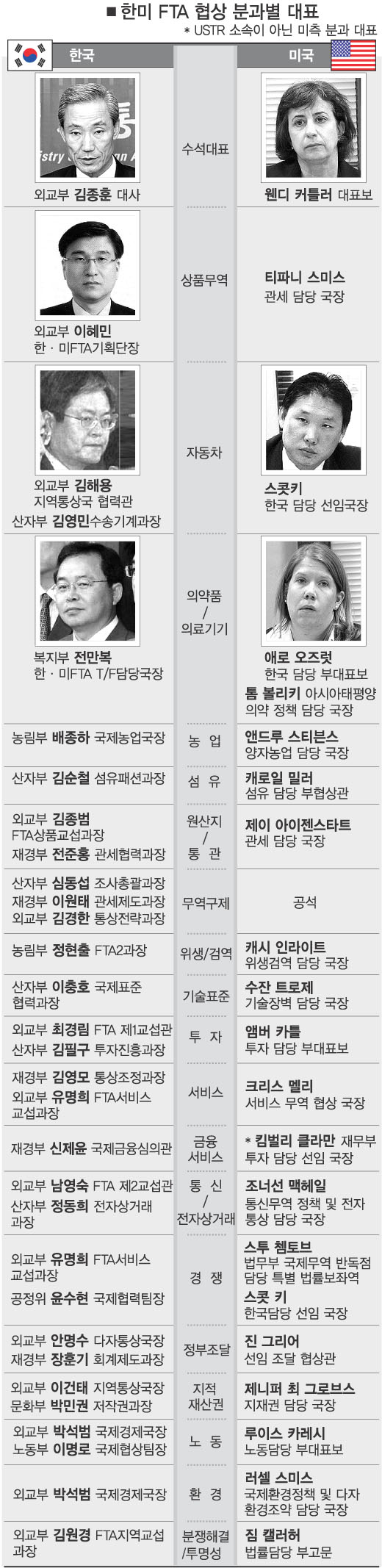 정부조달 분과를 지휘하는 안명수(50) 통상교섭본부 다자통상국장은 북미통상과장·주제네바 참사관·통상법류지원팀장 등을 지냈다. 협상 전부터 미국의 거센 개방 압력으로 관심을 모으고 있는 상품무역분과내 자동차 작업반은 외교부 김해용(49) 지역통상협력관이 맡고 있다.1995∼96년 북미통상과에 근무하면서 한·미 무역실무위원회에 참여, 자동차 등 통상 현안들을 직접 다룬 경험이 있다.