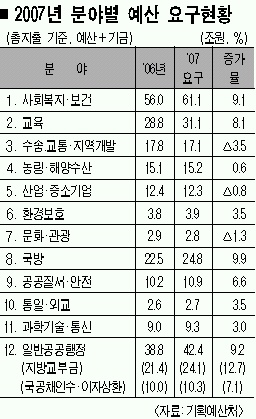 이는 올해 정부 부처가 사용키로 한 총예산 222조원보다 15조원 증가한 것이며,‘2005∼2009 국가재정운용계획상 지출규모’ 중 내년도 계획안인 234조 8000억원보다도 2조 2000억원 늘어난 규모다. 올해 총예산 증가율은 5.9%였다.