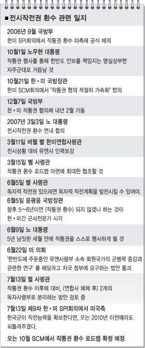 그렇다면 왜 하필 2010년일까. 외교 소식통은 “특별한 의미가 있다기보다는, 미국이 진정으로 작전권을 반환할 의사가 있다는 점을 강조하기 위해 한국의 목표보다 앞선 시점을 제시한 것 같다.”고 해석했다. 이제 부담은 우리 정부 쪽이 커졌다. 독자적 작통권 행사를 위해서는 감시·정찰장비 수준이 지금보다 2∼3배가량 향상돼야 하기 때문에 4년 이내에 천문학적인 국방예산 투입이 필요하다. 여기에 미군에 비해 실전 경험이 일천한 지휘관들의 전쟁지휘 노하우는 단기간 내에 축적되기 힘든 사안이라는 점도 고민이다.