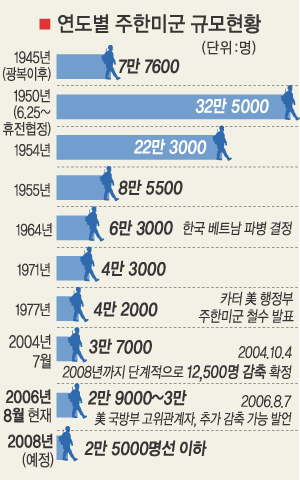 이와 관련, 한국 국방부는 8일 “감축이 아닌 조정의 문제”라고 밝혔다. 한 관계자는 “한·미간에는 현재 2008년까지 주한미군 1만 2500명을 줄여 2만 5000명 수준을 유지한다는 합의에 따라 감축이 이뤄지고 있다.”면서 “‘2만 5000명 유지’라는 큰 틀에는 변화가 없다.”고 설명했다.