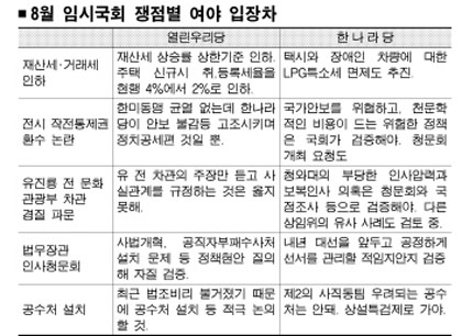 재산세·거래세 인하를 위한 지방세법 개정안은 여야 모두 합의처리에 이견을 보이지 않고 있다. 하지만 비정규직 관련 3법을 비롯해 일부 미묘한 사안은 여야간 정치공방에 가려 처리가 미뤄질 가능성도 있어 주목된다.