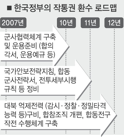 한편 국방부는 이날 작통권 환수를 위한 우리 정부의 로드맵도 발표했다. 먼저 2010년까지 군사협력체계 구축을 위한 합의각서나 운용 예규 등을 체결키로 했다. 특히 ‘작전계획 5027’을 대신해 한국군이 주도할 새로운 ‘공동작전계획서’도 2010년까지 작성될 전망이다. 이어 2011년까지 현재의 연합방위 전략체계를 한국군 주도의 전쟁수행 체계로 전환키로 했다. 이를 위해 국가안보전략지침, 합동작전계획, 전투세부시행규칙 등을 정비할 계획이다.
