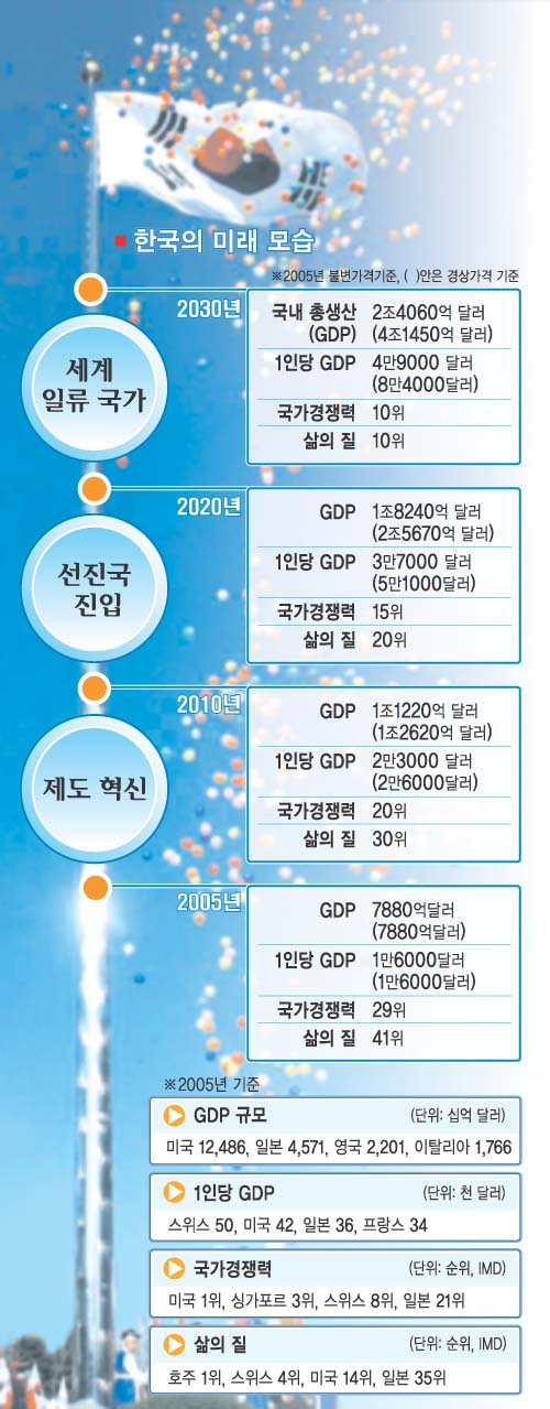 장병완 기획예산처장관은 이날 서울 세종로 정부중앙청사에서 노무현 대통령과 국무위원, 민간 전문가 등 180여명이 참석한 가운데 ‘비전 2030 보고회의’를 갖고 이같은 내용의 ‘비전 2030-함께 가는 희망한국’이라는 중장기비전 보고서를 발표했다.