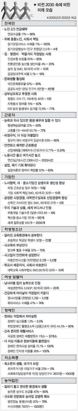 정부는 ‘비전 2030’에 지금까지 각 부처에서 발표한 국방계획, 국민연금개혁안, 저출산·고령화대책 등을 모두 담았다. 복지 수준을 선진국 수준으로 끌어 올리기 위해 국내총생산(GDP)의 2% 정도의 추가 비용이 필요하다는 의견을 처음으로 제시했다.