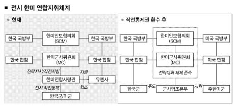 전시(戰時) 작전통제권 환수로 한미 연합사령부가 해체되면 한국군의 육·해·공군 등 각군 사령부에 주한미군의 해당 사령부 ‘작전협조반’이 파견돼 지원하게 된다. 양국 군간의 협력을 위해 설치될 가칭 ‘군사협조본부’는 현재 연합사가 한·미간 군사협력을 보장하는 총괄기구인 안보협의회(SCM)와 군사위원회(MC)로부터 전략지시를 받는 것처럼 SCM과 MC의 통제를 받게 된다.