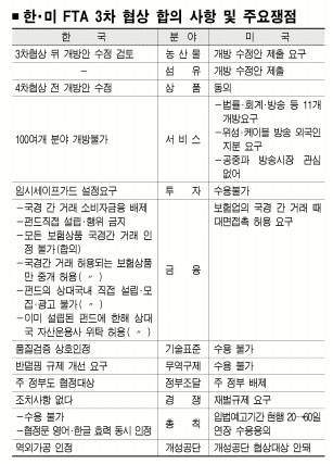 한·미 자유무역협정(FTA) 협상단은 시애틀 3차 협상을 통해 핵심분야에 대한 실질적인 진전을 이뤄내지는 못했지만 상대방의 ‘패’를 펴놓고 속내를 읽는 자리였다. 협상 쟁점들이 보다 명확해지고 구체화됐으며 상대방의 진짜 의도를 파악하는 기회가 됐다.