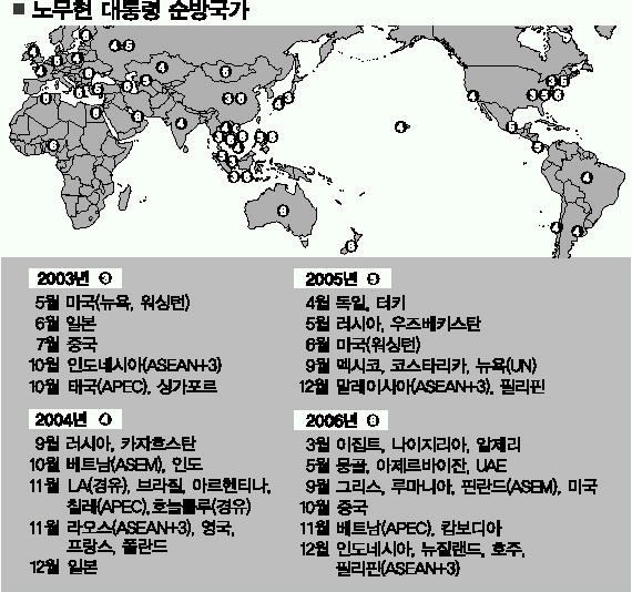 올해는 국빈 및 공식방문, 다자간 또는 양자간 정상회담을 위해 지난 3월부터 이번까지 6차례에 걸쳐 17개국을 방문했다. 체류일을 따지면 무려 41일이나 된다. 노 대통령은 취임 첫해의 경우, 미국 뉴욕과 워싱턴을 처음 찾은 것을 비롯,5차례 6개국을 방문했다.2004년에는 9월 러시아 등 5차례 14개국,2005년에는 5차례 10개국을 순방했다. 순방국 중 미국(뉴욕·워싱턴·LA·샌프란시스코)이 5차례로 가장 많다.