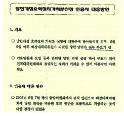 문건은 “당헌 개정이 무효화될 경우 기초당원제 도입에 따른 현재의 당원협의회 운영위원장 및 대의원 선출 과정 자체가 무효가 되기 때문에 당헌을 재의결한 뒤 이에 대한 소급 적용하는게 필요하다.”고 제시했다. 중앙위에서 비대위 사퇴 공방이 강하게 제기될 경우에 대한 대응책도 제시됐다. 문건은 “당헌·당규에는 중앙위가 비대위에 대한 신임 여부를 추궁할 수 있는 조항이 없으며 단지 중앙위·의원총회 연석회의를 소집할 수 있는 권한만 부여돼 있다.”고 설명했다. 지도부가 사퇴한 뒤 중앙위·의원총회 연석회의를 열어 비대위를 재구성하는 ‘두번째 대응방안’은 매우 비관적이다.