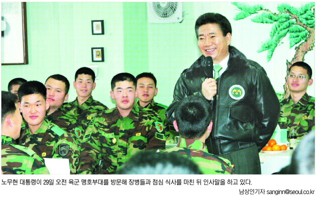 노 대통령은 맹호부대로 이동, 장병들과 오찬을 함께 한 자리에서 “군 복무제도 변경은 꼭 필요한 일”이라면서 “학제와 더불어 아주 길게 점진적으로 해 나갈 것”이라고 말했다.