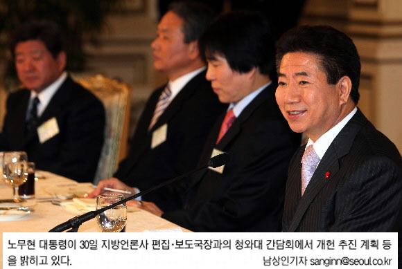 노무현 대통령은 이날 지역언론사 편집·보도국장들과의 청와대 오찬간담회에서 “지역균형발전에 대한 2단계 정책을 지금 다듬고 있다.”면서 “연내 입법할 계획”이라고 말했다. 노 대통령은 2단계 균형발전과 관련,“벌써 균형발전의 결과를 가지고 성공·실패를 얘기하는 것은 좀 무리”라면서 “그러나 수도권 흡입력의 큰 흐름으로 봐서는 지금까지의 정책으로는 너무 느리거나 좀 부족하다는 생각이 들어서”라고 취지를 설명했다.