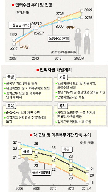 현역병 복무기간이 2014년까지 단계적으로 6개월 단축된다. 이렇게 되면 2014년 7월 입대자는 18개월만 복무하면 된다. 공익행정요원과 전·의경 등 대체복무제도는 2011∼12년부터 폐지하는 대신 중증 장애인 등을 제외한 병역의무 대상자는 모두 사회서비스 분야에서 일하는 ‘사회복무제도’를 도입한다.