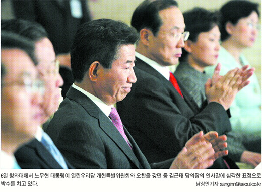 노 대통령은 “개헌 제안에 대해 당과 사전에 조율을 못해 미안하다.”면서 “상의하려 고심했으나 정략적으로 보이지 않기 위해 일부러 협의를 안했다.”고 양해를 구했다.