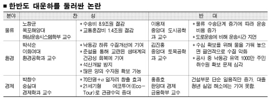 그러나 ‘한반도 대운하’에 대한 우려도 적지 않다. 중앙대 이용재(도시공학과) 교수는 “운하를 통해 물류를 운송하게 되면 수송단계가 증가해 운송비용도 늘어난다.”면서 “또 도로운송에 비해 운송시간이 지연되는 점도 감안해야 한다.”고 말했다. 환경문제에 대해 중앙대 김진홍(토목공학과) 교수는 “수심확보를 위해 물을 가둬 놓으면 필연적으로 수질이 악화될 수밖에 없다.”면서 또 “논란중인 낙동강 유역 1000만 주민들의 취수원 확보 문제도 심각하다.”고 말했다. 한양대 홍종호(경제금융학부) 교수는 “한반도 대운하를 건설하는 과정에서 건설부문의 단순 일용직 근로자는 증가하겠지만, 대졸 청년실업에는 별다른 효과가 없을 것”이라고 비판했다.