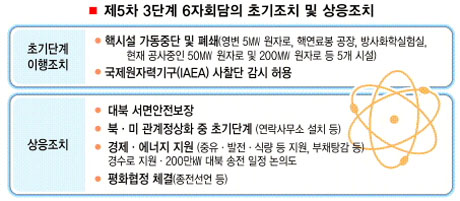 이에 따라 6자회담 재개와 동시에 핵폐기 초기이행조치와 상응조치간 합의 가능성이 높아지고 있다. 의장국인 중국은 이날 북·미간 큰 틀의 합의를 바탕으로 초기조치와 상응조치 이행 계획을 담은 합의문 초안을 마련, 참가국들에 회람시키는 등 적극 중재에 나섰다. 북한은 기조연설을 통해 핵폐기 초기조치에 대한 강력한 이행 의지를 밝힌 것으로 알려졌다.